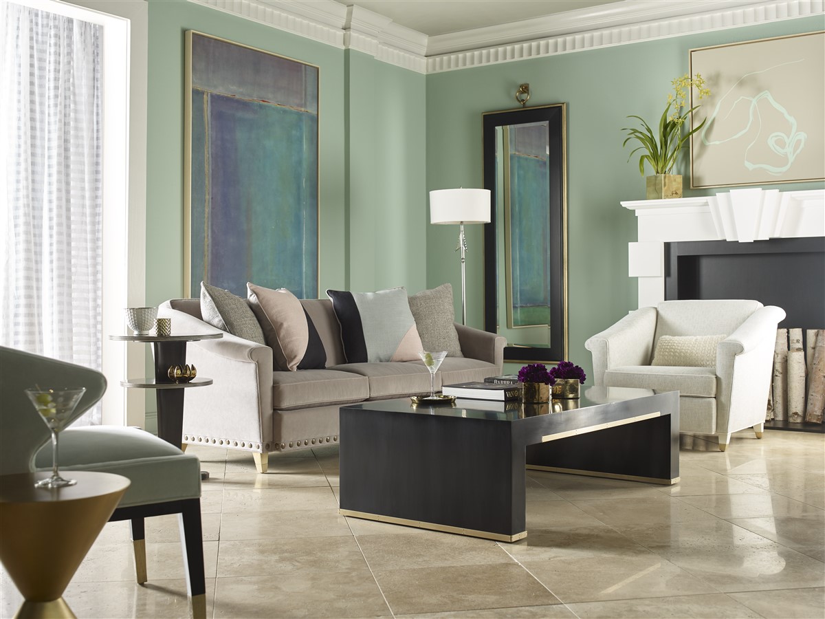 Elegant tuxedo-style inspired sofa. Graceful and shapely sock arms rise to meet the high, perfectly pitched sofa back. Banded base tailoring options include tape trim with oversized nailhead trim. Standard with two 22″ throw pillows. Available in choice of fabric or leather and finish with hardware choice of Antique Brass or Polished Nickel. Customization is possible.